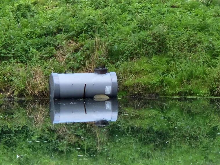 Geschlossene und geprüfte Nutriafalle Weka Invasiv an Klärteich